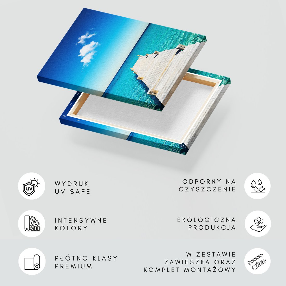 Obraz na płótnie z motywem morze, pomost, woda to kwintesencja estetyki i trwałości. Dzięki łatwemu montażowi i uniwersalnemu wzornictwu, czyni go idealnym wyborem zarówno do codziennego użytku, jak i na wyrafinowany prezent.