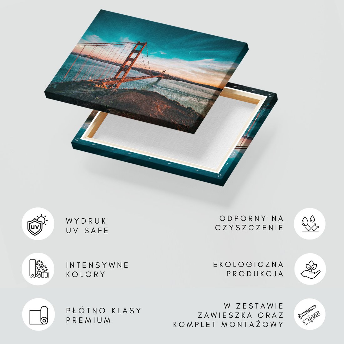 Obraz na płótnie z motywem most, Golden Gate, San Francisco to kwintesencja estetyki i trwałości. Dzięki łatwemu montażowi i uniwersalnemu wzornictwu, czyni go idealnym wyborem zarówno do codziennego użytku, jak i na wyrafinowany prezent.