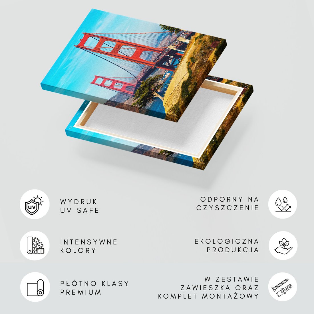 Obraz na płótnie z motywem most, Golden Gate, San Francisco to kwintesencja estetyki i trwałości. Dzięki łatwemu montażowi i uniwersalnemu wzornictwu, czyni go idealnym wyborem zarówno do codziennego użytku, jak i na wyrafinowany prezent.