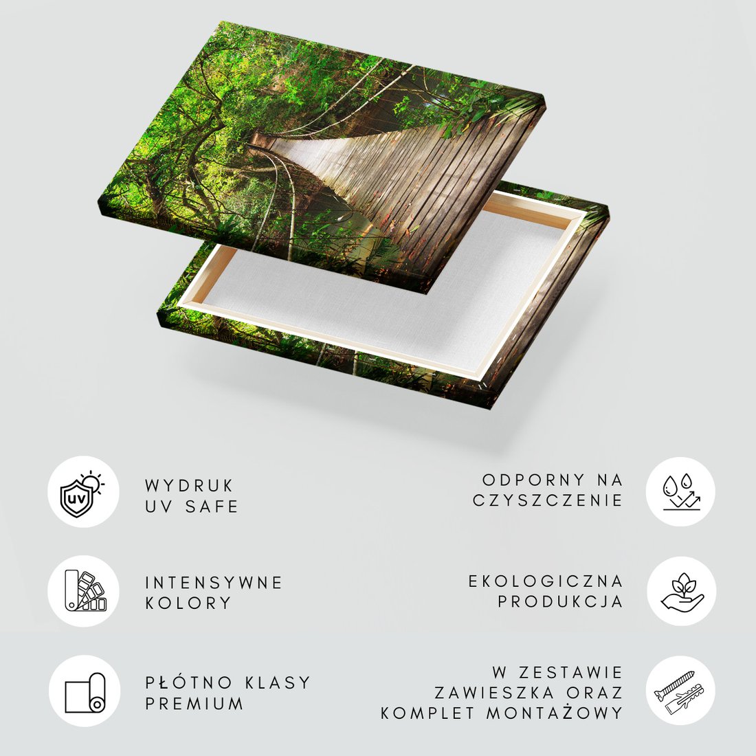 Obraz na płótnie z motywem most, las, natura to kwintesencja estetyki i trwałości. Dzięki łatwemu montażowi i uniwersalnemu wzornictwu, czyni go idealnym wyborem zarówno do codziennego użytku, jak i na wyrafinowany prezent.
