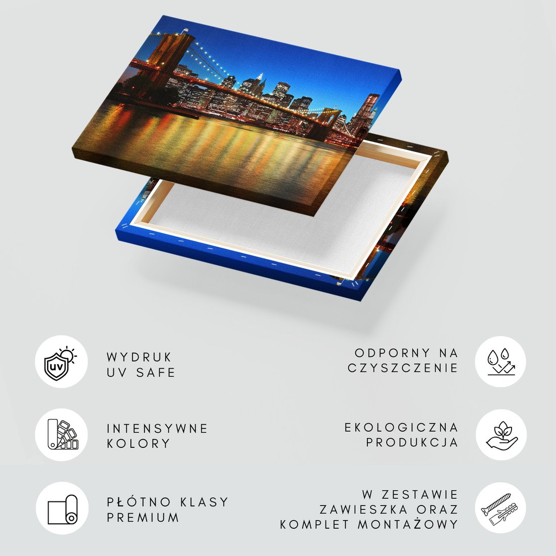 Obraz na płótnie z motywem most, miasto, noc to kwintesencja estetyki i trwałości. Dzięki łatwemu montażowi i uniwersalnemu wzornictwu, czyni go idealnym wyborem zarówno do codziennego użytku, jak i na wyrafinowany prezent.