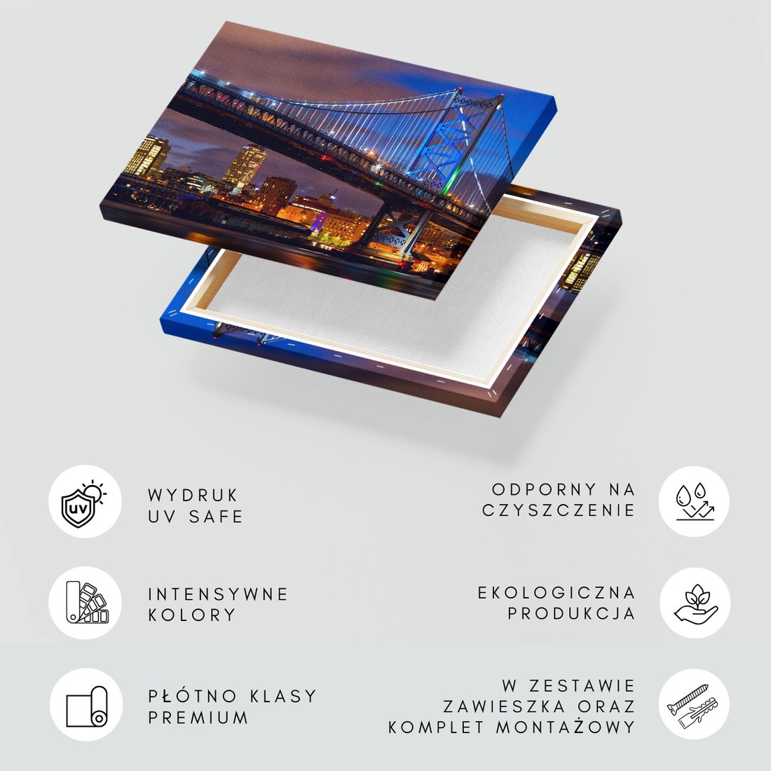Obraz na płótnie z motywem most, miasto, noc to kwintesencja estetyki i trwałości. Dzięki łatwemu montażowi i uniwersalnemu wzornictwu, czyni go idealnym wyborem zarówno do codziennego użytku, jak i na wyrafinowany prezent.