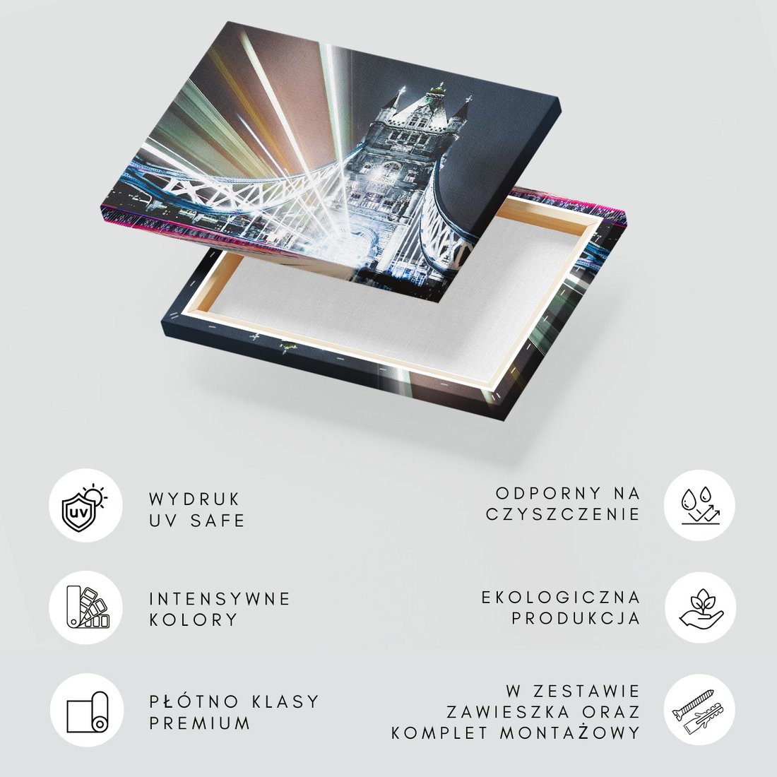 Obraz na płótnie z motywem most, miasto, noc to kwintesencja estetyki i trwałości. Dzięki łatwemu montażowi i uniwersalnemu wzornictwu, czyni go idealnym wyborem zarówno do codziennego użytku, jak i na wyrafinowany prezent.