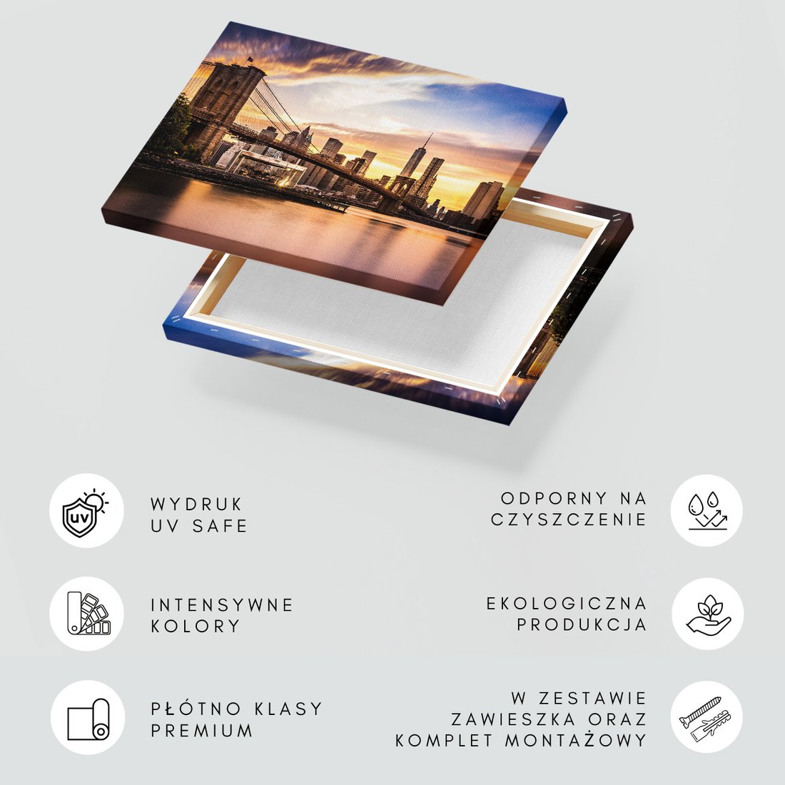 Obraz na płótnie z motywem most, miasto, woda to kwintesencja estetyki i trwałości. Dzięki łatwemu montażowi i uniwersalnemu wzornictwu, czyni go idealnym wyborem zarówno do codziennego użytku, jak i na wyrafinowany prezent.