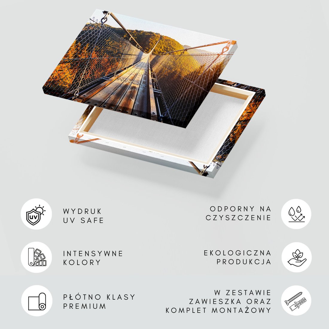 Obraz na płótnie z motywem most wiszący, krajobraz, natura to kwintesencja estetyki i trwałości. Dzięki łatwemu montażowi i uniwersalnemu wzornictwu, czyni go idealnym wyborem zarówno do codziennego użytku, jak i na wyrafinowany prezent.