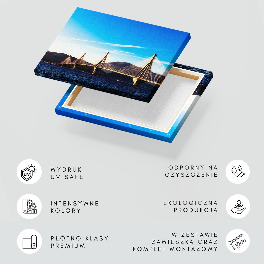 Obraz na płótnie z motywem most, woda, niebo to kwintesencja estetyki i trwałości. Dzięki łatwemu montażowi i uniwersalnemu wzornictwu, czyni go idealnym wyborem zarówno do codziennego użytku, jak i na wyrafinowany prezent.