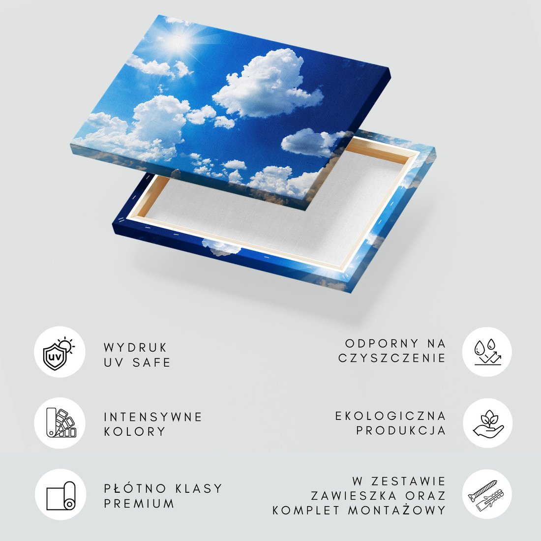 Obraz na płótnie z motywem niebo, chmury, słońce to kwintesencja estetyki i trwałości. Dzięki łatwemu montażowi i uniwersalnemu wzornictwu, czyni go idealnym wyborem zarówno do codziennego użytku, jak i na wyrafinowany prezent.