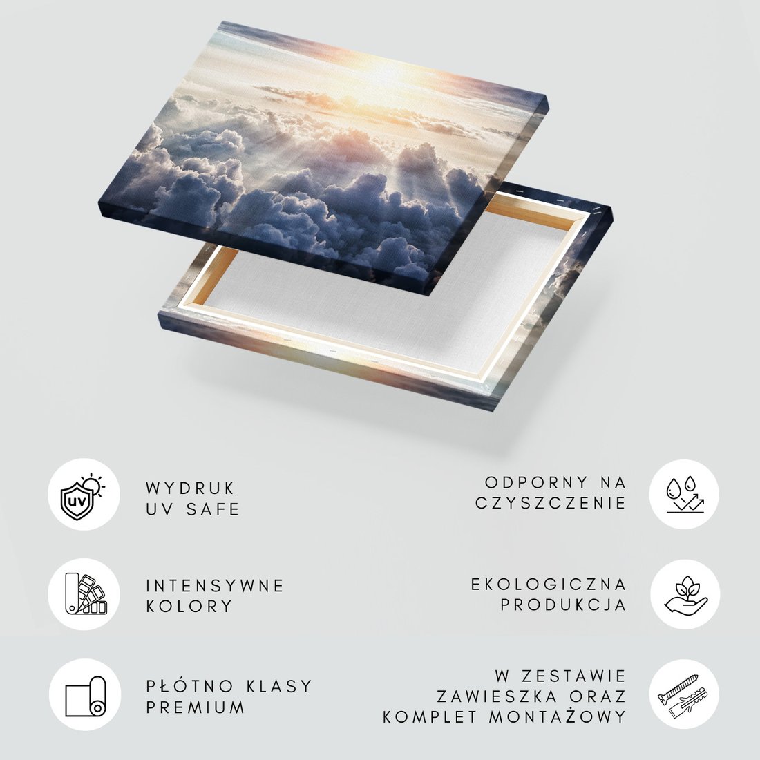 Obraz na płótnie z motywem niebo, chmury, słońce to kwintesencja estetyki i trwałości. Dzięki łatwemu montażowi i uniwersalnemu wzornictwu, czyni go idealnym wyborem zarówno do codziennego użytku, jak i na wyrafinowany prezent.