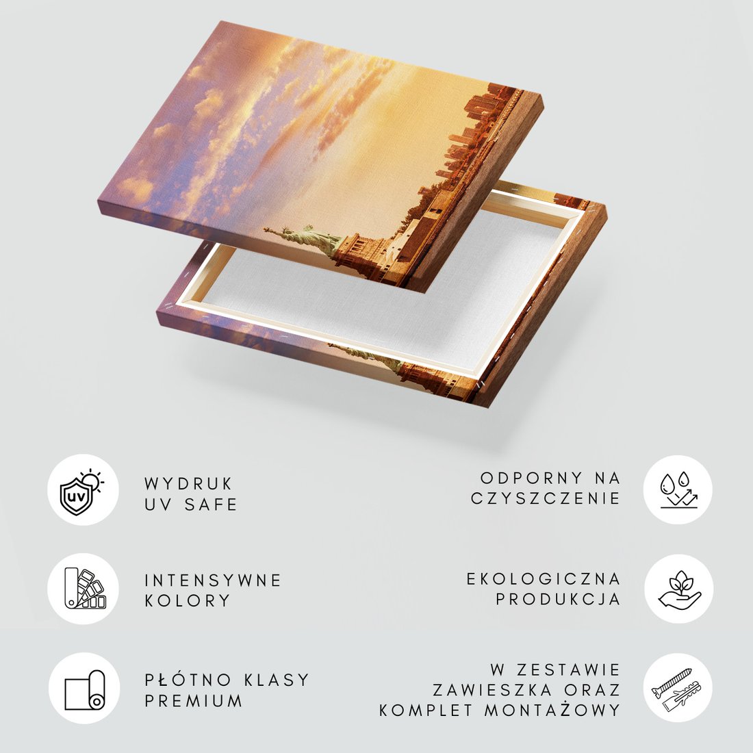 Obraz na płótnie z motywem Nowy Jork, Statua Wolności, miasto to kwintesencja estetyki i trwałości. Dzięki łatwemu montażowi i uniwersalnemu wzornictwu, czyni go idealnym wyborem zarówno do codziennego użytku, jak i na wyrafinowany prezent.