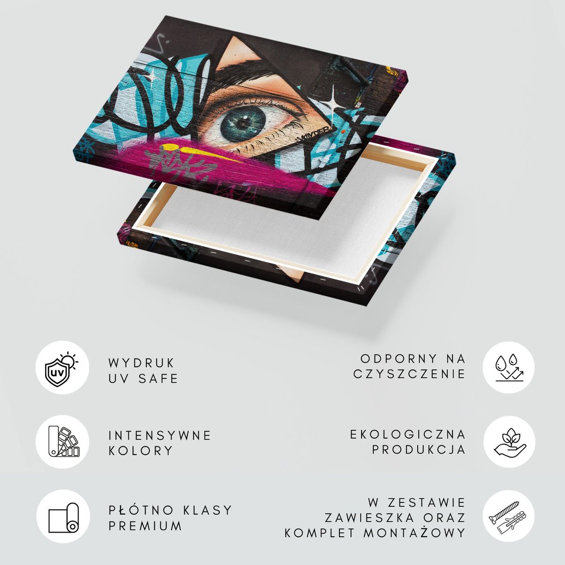 Obraz na płótnie z motywem oko, graffiti, ściana to kwintesencja estetyki i trwałości. Dzięki łatwemu montażowi i uniwersalnemu wzornictwu, czyni go idealnym wyborem zarówno do codziennego użytku, jak i na wyrafinowany prezent.