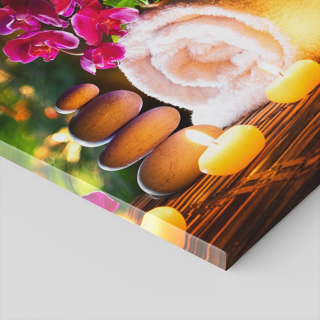 Obraz na płótnie z motywem orchidee, spa, relaks to kwintesencja estetyki i trwałości. Dzięki łatwemu montażowi i uniwersalnemu wzornictwu, czyni go idealnym wyborem zarówno do codziennego użytku, jak i na wyrafinowany prezent.