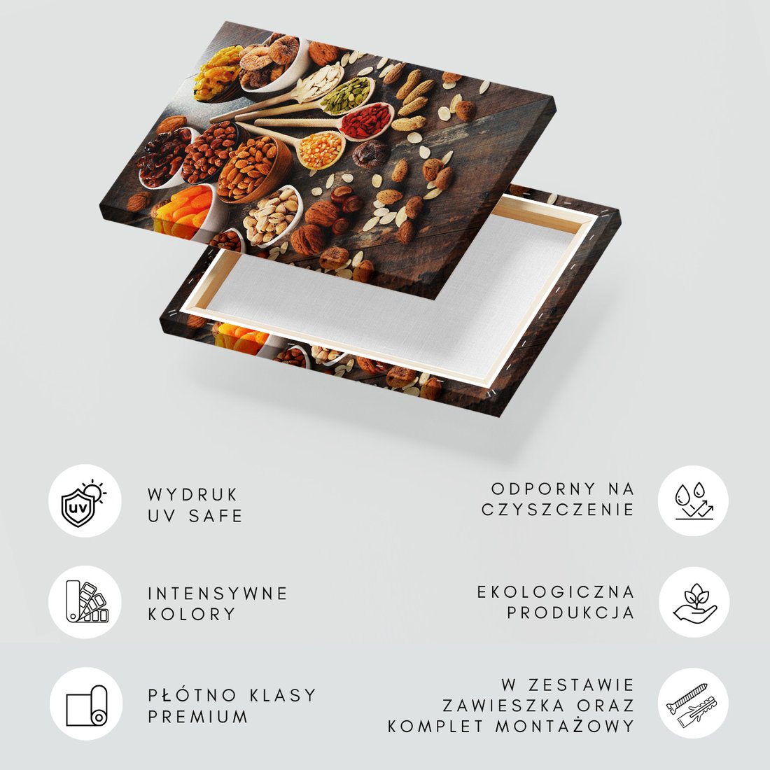 Obraz na płótnie z motywem orzechy, suszone owoce, jedzenie to kwintesencja estetyki i trwałości. Dzięki łatwemu montażowi i uniwersalnemu wzornictwu, czyni go idealnym wyborem zarówno do codziennego użytku, jak i na wyrafinowany prezent.