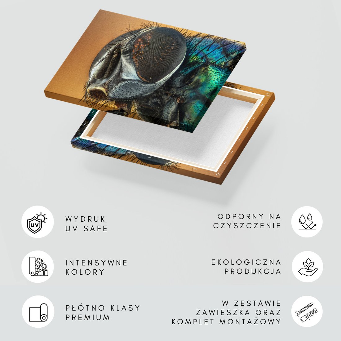 Obraz na płótnie z motywem owad, mucha, makro to kwintesencja estetyki i trwałości. Dzięki łatwemu montażowi i uniwersalnemu wzornictwu, czyni go idealnym wyborem zarówno do codziennego użytku, jak i na wyrafinowany prezent.
