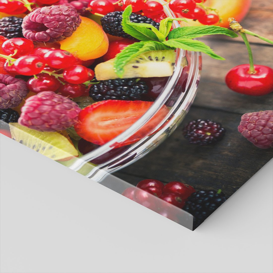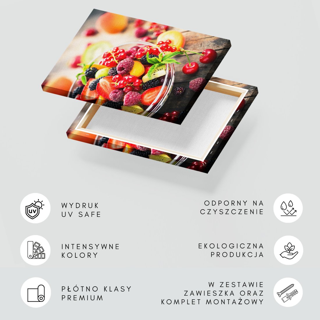 Obraz na płótnie z motywem owoce, deser, witaminy to kwintesencja estetyki i trwałości. Dzięki łatwemu montażowi i uniwersalnemu wzornictwu, czyni go idealnym wyborem zarówno do codziennego użytku, jak i na wyrafinowany prezent.