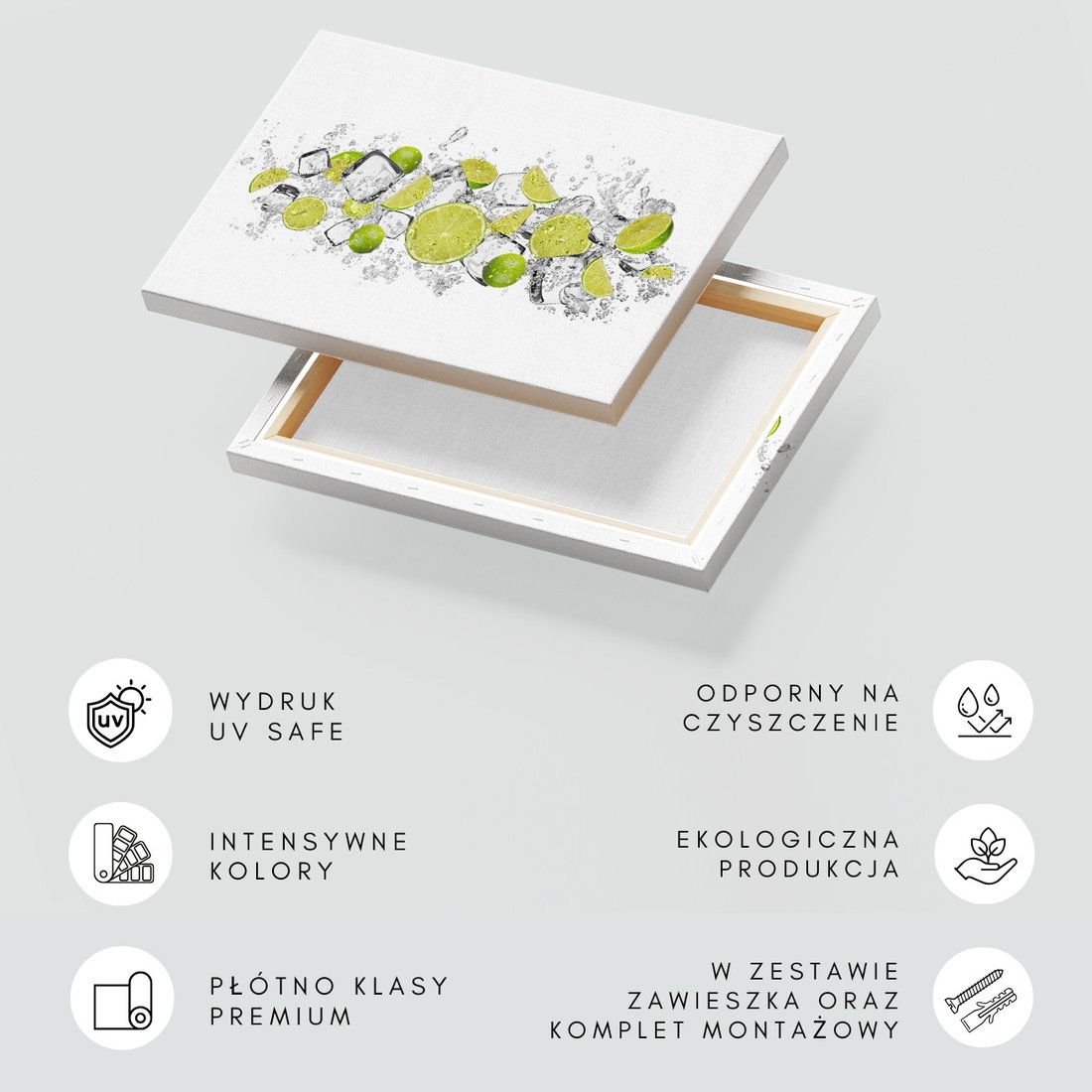 Obraz na płótnie z motywem owoce, limonki, kostki lodu to kwintesencja estetyki i trwałości. Dzięki łatwemu montażowi i uniwersalnemu wzornictwu, czyni go idealnym wyborem zarówno do codziennego użytku, jak i na wyrafinowany prezent.