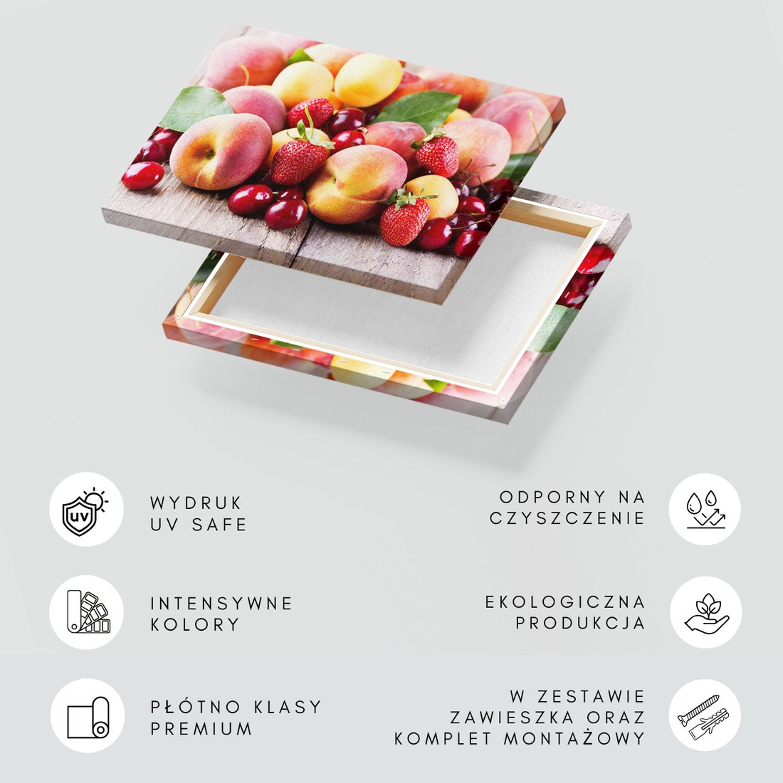 Obraz na płótnie z motywem owoce, świeże, słodkie to kwintesencja estetyki i trwałości. Dzięki łatwemu montażowi i uniwersalnemu wzornictwu, czyni go idealnym wyborem zarówno do codziennego użytku, jak i na wyrafinowany prezent.