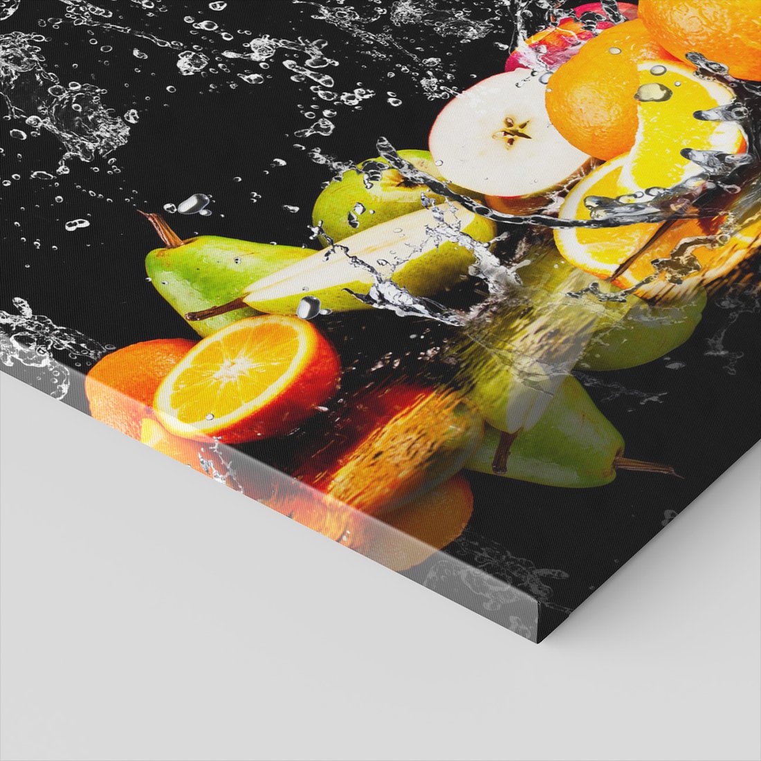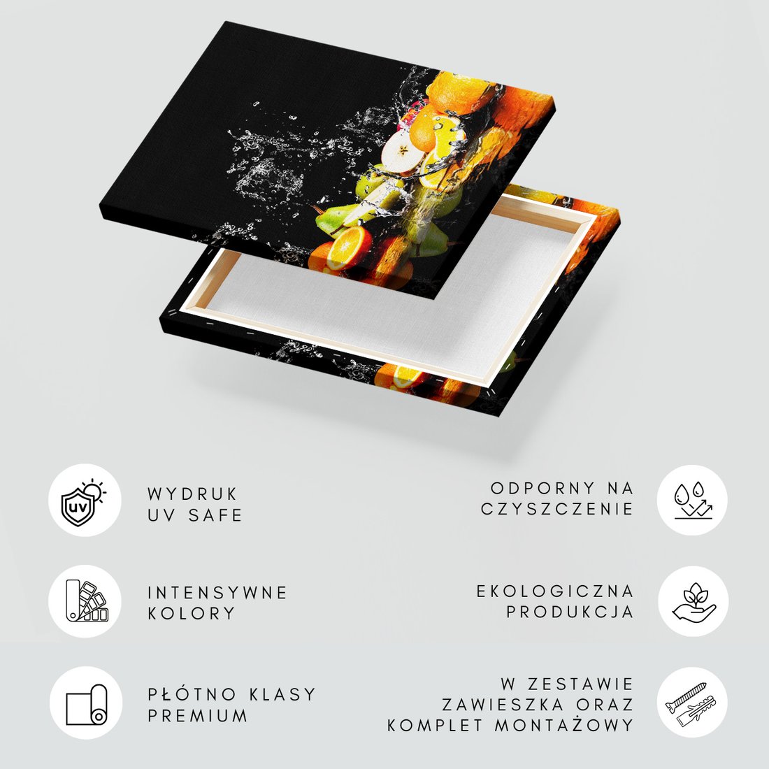 Obraz na płótnie z motywem owoce, woda, świeżość to kwintesencja estetyki i trwałości. Dzięki łatwemu montażowi i uniwersalnemu wzornictwu, czyni go idealnym wyborem zarówno do codziennego użytku, jak i na wyrafinowany prezent.