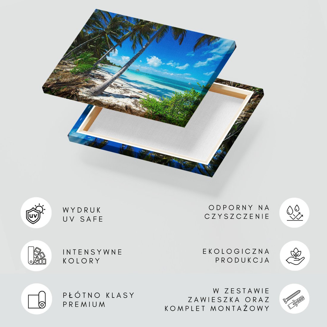 Obraz na płótnie z motywem palmy, plaża, morze to kwintesencja estetyki i trwałości. Dzięki łatwemu montażowi i uniwersalnemu wzornictwu, czyni go idealnym wyborem zarówno do codziennego użytku, jak i na wyrafinowany prezent.