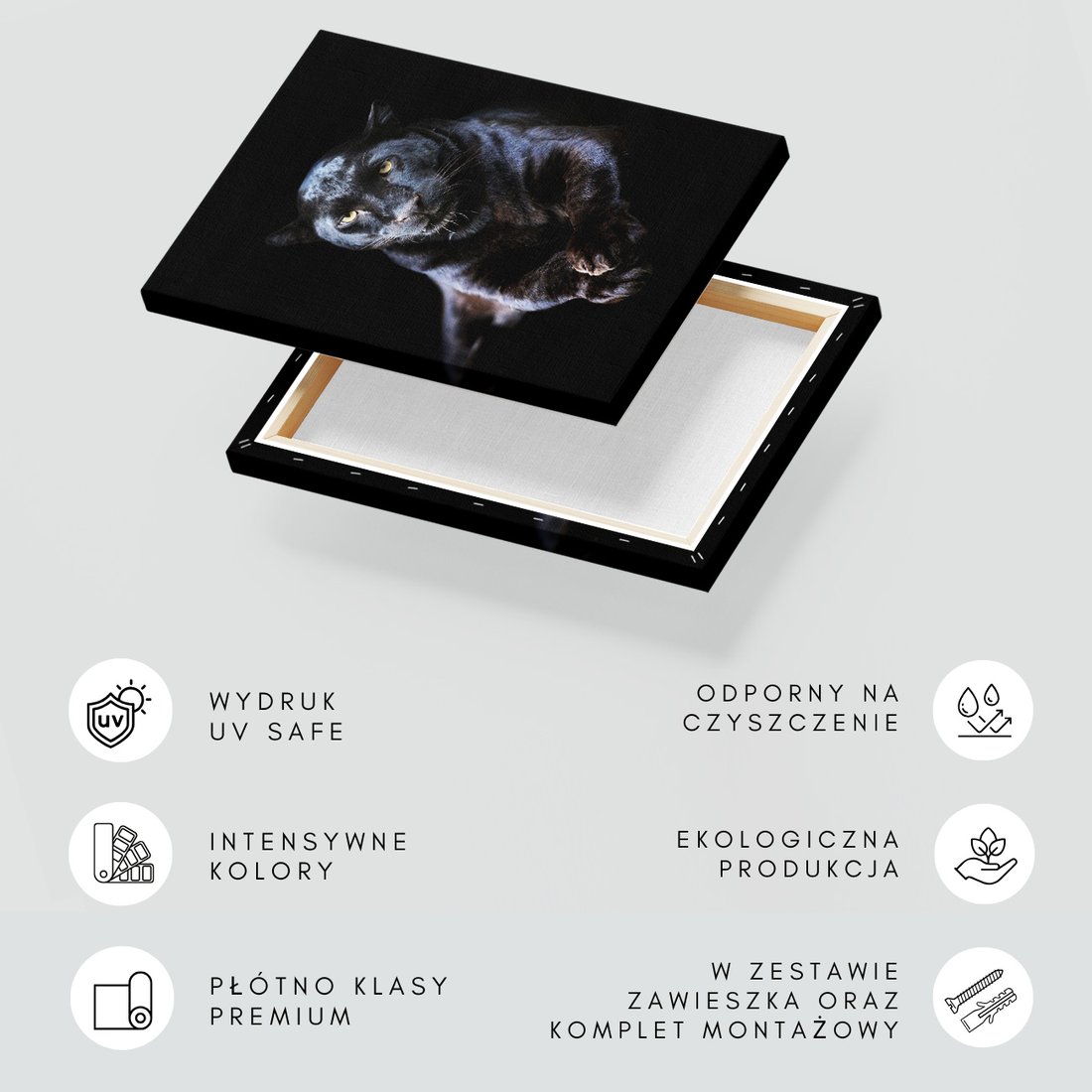 Obraz na płótnie z motywem pantera, czarna, kot to kwintesencja estetyki i trwałości. Dzięki łatwemu montażowi i uniwersalnemu wzornictwu, czyni go idealnym wyborem zarówno do codziennego użytku, jak i na wyrafinowany prezent.