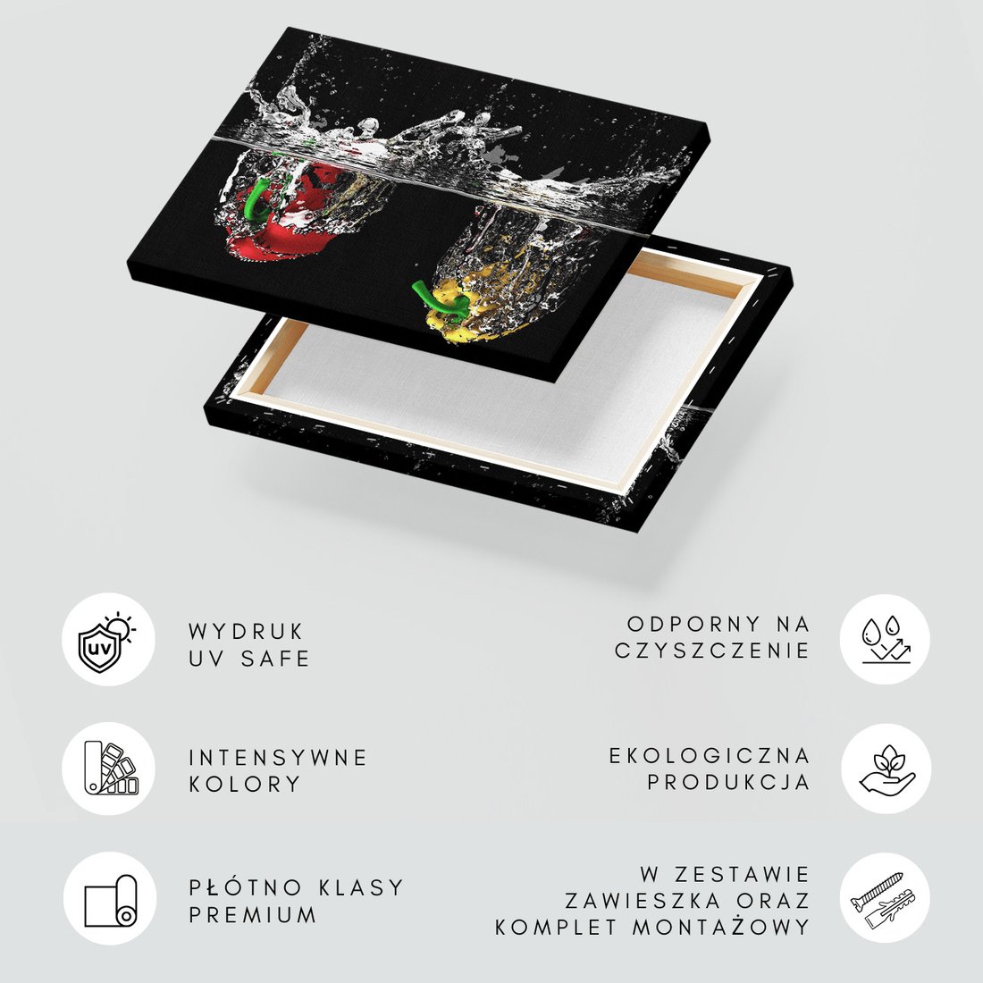 Obraz na płótnie z motywem papryka, woda, plusk to kwintesencja estetyki i trwałości. Dzięki łatwemu montażowi i uniwersalnemu wzornictwu, czyni go idealnym wyborem zarówno do codziennego użytku, jak i na wyrafinowany prezent.