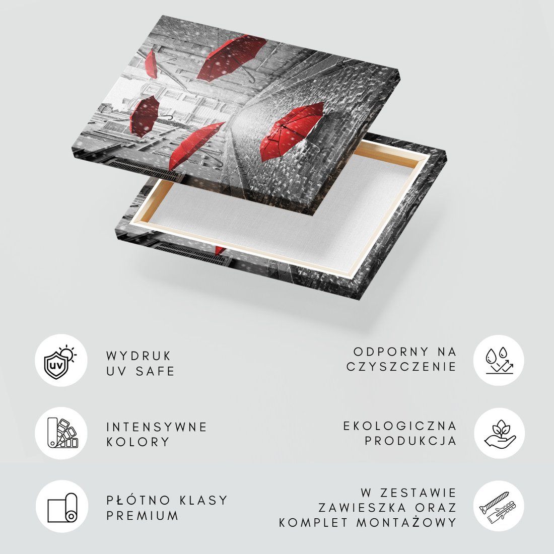 Obraz na płótnie z motywem parasole, deszcz, ulica to kwintesencja estetyki i trwałości. Dzięki łatwemu montażowi i uniwersalnemu wzornictwu, czyni go idealnym wyborem zarówno do codziennego użytku, jak i na wyrafinowany prezent.