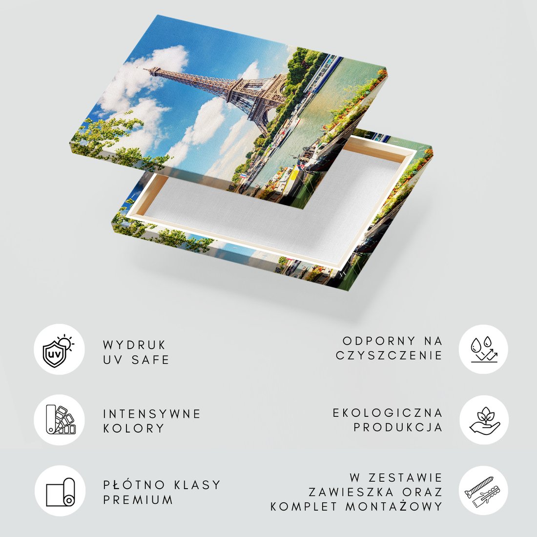 Obraz na płótnie z motywem Paryż, Wieża Eiffla, rzeka to kwintesencja estetyki i trwałości. Dzięki łatwemu montażowi i uniwersalnemu wzornictwu, czyni go idealnym wyborem zarówno do codziennego użytku, jak i na wyrafinowany prezent.