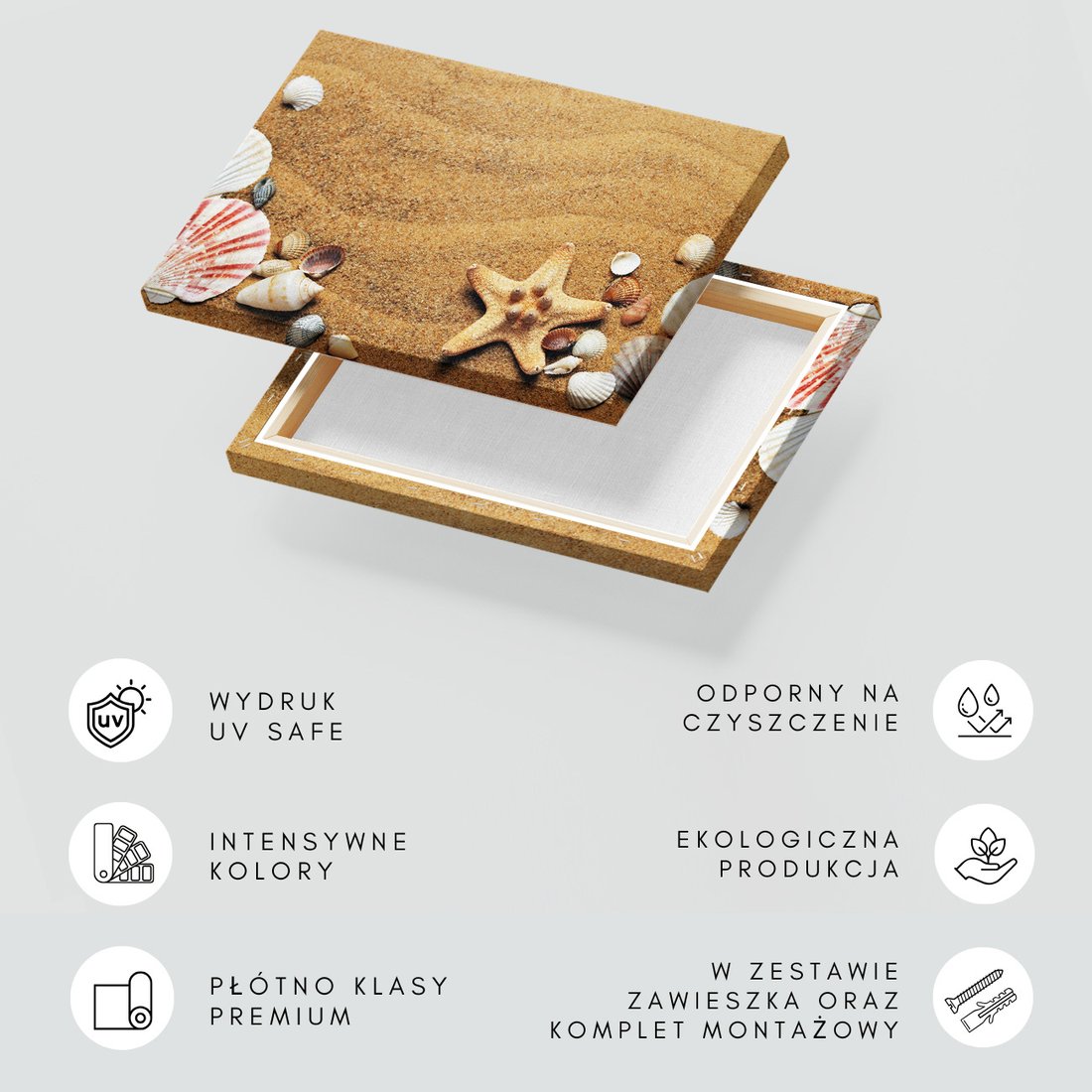 Obraz na płótnie z motywem piasek, muszle, rozgwiazda to kwintesencja estetyki i trwałości. Dzięki łatwemu montażowi i uniwersalnemu wzornictwu, czyni go idealnym wyborem zarówno do codziennego użytku, jak i na wyrafinowany prezent.