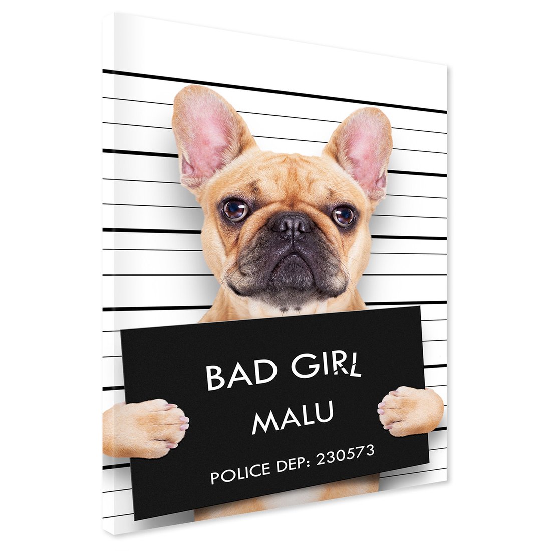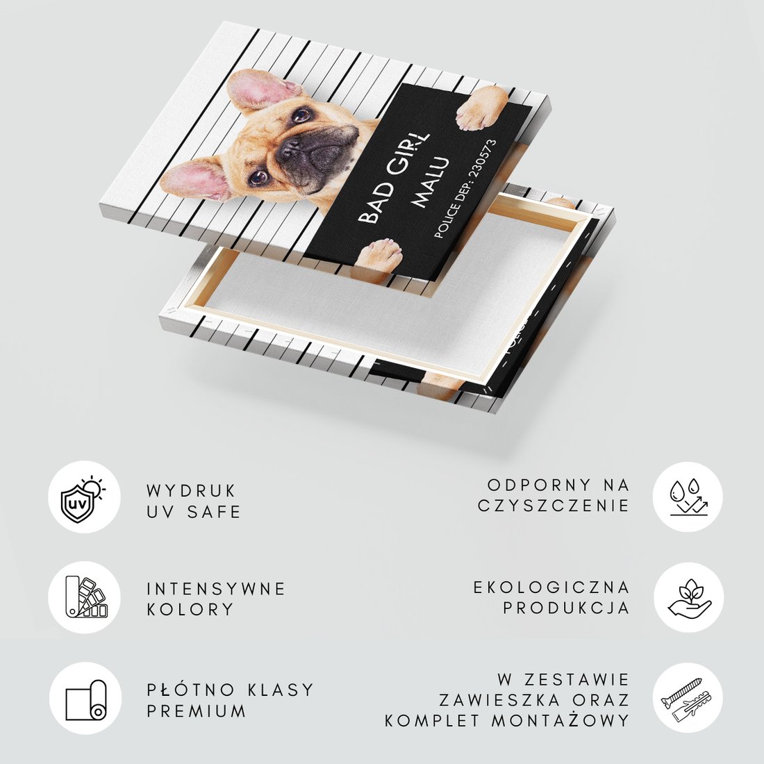 Obraz na płótnie z motywem pies, buldog, tablica to kwintesencja estetyki i trwałości. Dzięki łatwemu montażowi i uniwersalnemu wzornictwu, czyni go idealnym wyborem zarówno do codziennego użytku, jak i na wyrafinowany prezent.