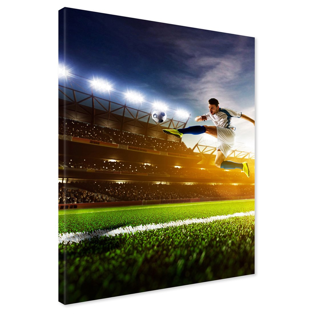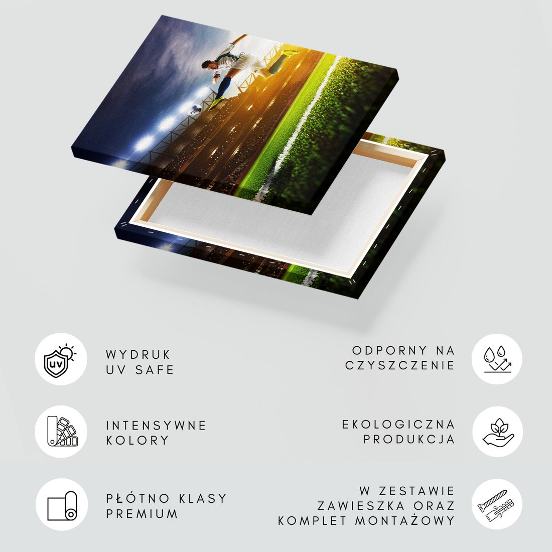 Obraz na płótnie z motywem piłka nożna, sport, stadion to kwintesencja estetyki i trwałości. Dzięki łatwemu montażowi i uniwersalnemu wzornictwu, czyni go idealnym wyborem zarówno do codziennego użytku, jak i na wyrafinowany prezent.