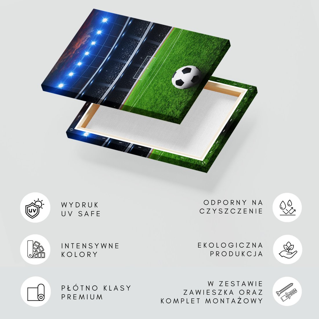 Obraz na płótnie z motywem piłka, nożna, stadion to kwintesencja estetyki i trwałości. Dzięki łatwemu montażowi i uniwersalnemu wzornictwu, czyni go idealnym wyborem zarówno do codziennego użytku, jak i na wyrafinowany prezent.