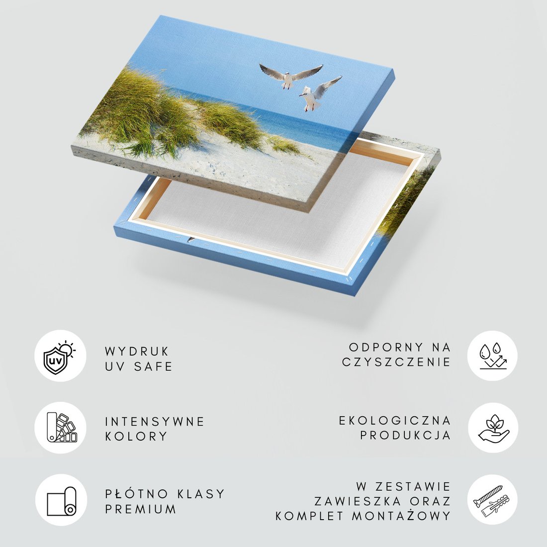 Obraz na płótnie z motywem plaża, mewy, morze to kwintesencja estetyki i trwałości. Dzięki łatwemu montażowi i uniwersalnemu wzornictwu, czyni go idealnym wyborem zarówno do codziennego użytku, jak i na wyrafinowany prezent.