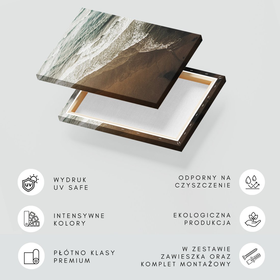 Obraz na płótnie z motywem plaża, morze, fale to kwintesencja estetyki i trwałości. Dzięki łatwemu montażowi i uniwersalnemu wzornictwu, czyni go idealnym wyborem zarówno do codziennego użytku, jak i na wyrafinowany prezent.