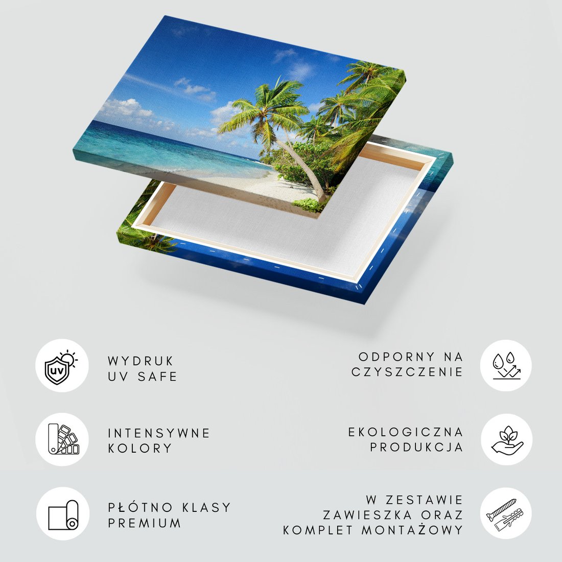 Obraz na płótnie z motywem plaża, morze, palmy to kwintesencja estetyki i trwałości. Dzięki łatwemu montażowi i uniwersalnemu wzornictwu, czyni go idealnym wyborem zarówno do codziennego użytku, jak i na wyrafinowany prezent.