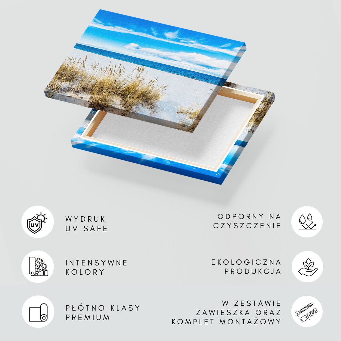 Obraz na płótnie z motywem plaża, morze, piasek to kwintesencja estetyki i trwałości. Dzięki łatwemu montażowi i uniwersalnemu wzornictwu, czyni go idealnym wyborem zarówno do codziennego użytku, jak i na wyrafinowany prezent.