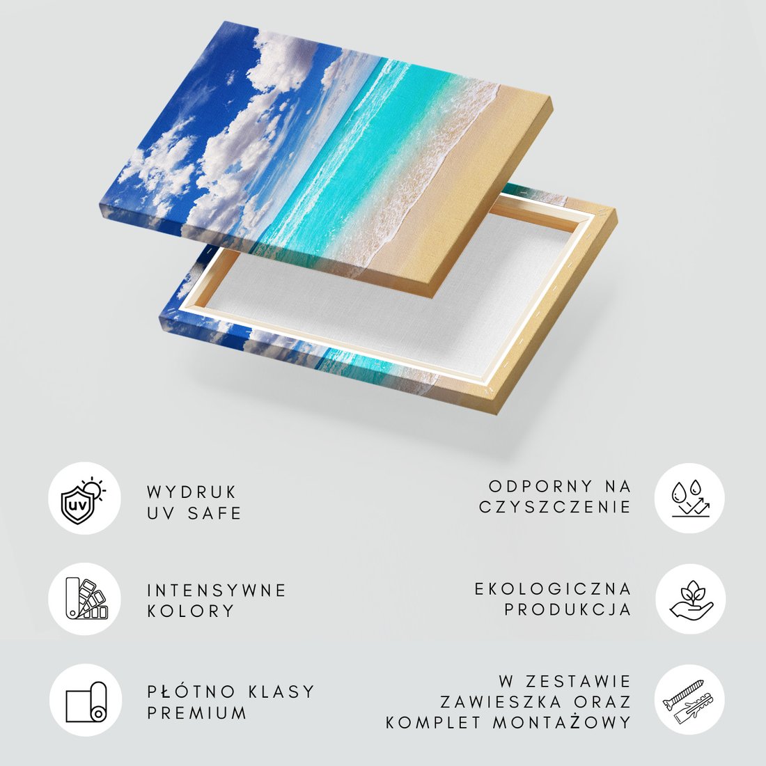 Obraz na płótnie z motywem plaża, morze, piasek to kwintesencja estetyki i trwałości. Dzięki łatwemu montażowi i uniwersalnemu wzornictwu, czyni go idealnym wyborem zarówno do codziennego użytku, jak i na wyrafinowany prezent.