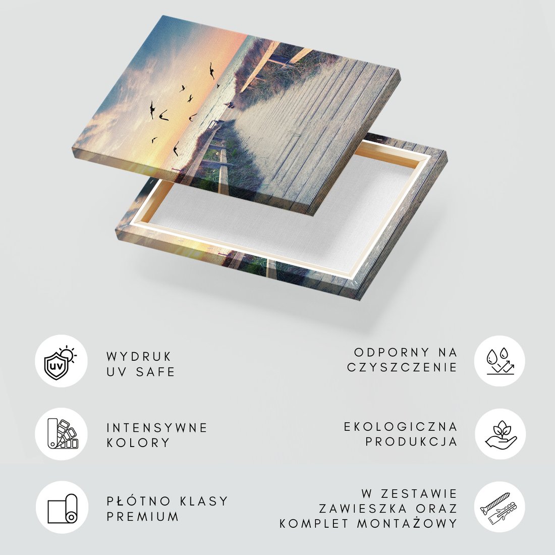 Obraz na płótnie z motywem plaża, morze, ptaki to kwintesencja estetyki i trwałości. Dzięki łatwemu montażowi i uniwersalnemu wzornictwu, czyni go idealnym wyborem zarówno do codziennego użytku, jak i na wyrafinowany prezent.