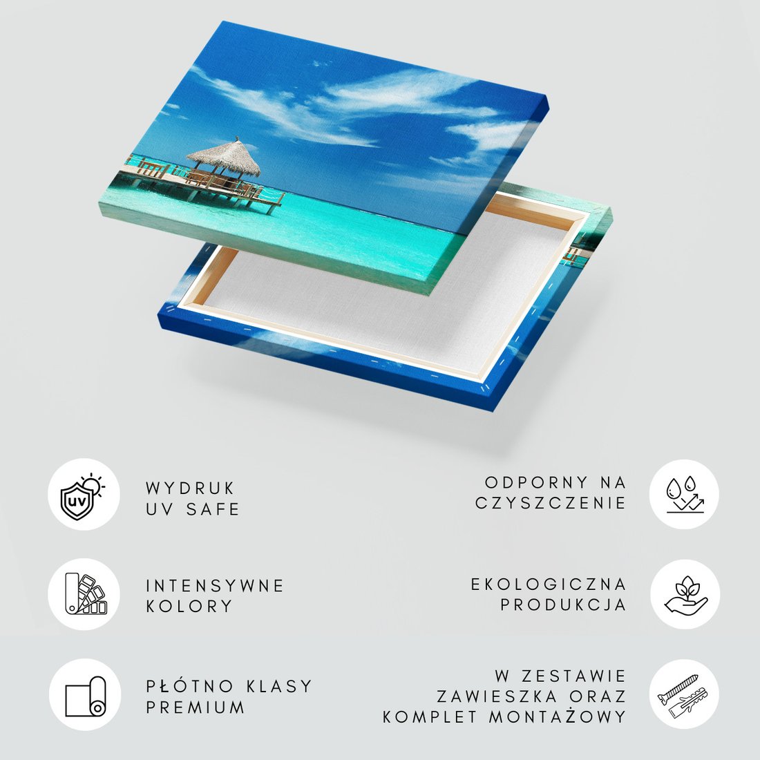 Obraz na płótnie z motywem plaża, morze, turkusowy to kwintesencja estetyki i trwałości. Dzięki łatwemu montażowi i uniwersalnemu wzornictwu, czyni go idealnym wyborem zarówno do codziennego użytku, jak i na wyrafinowany prezent.