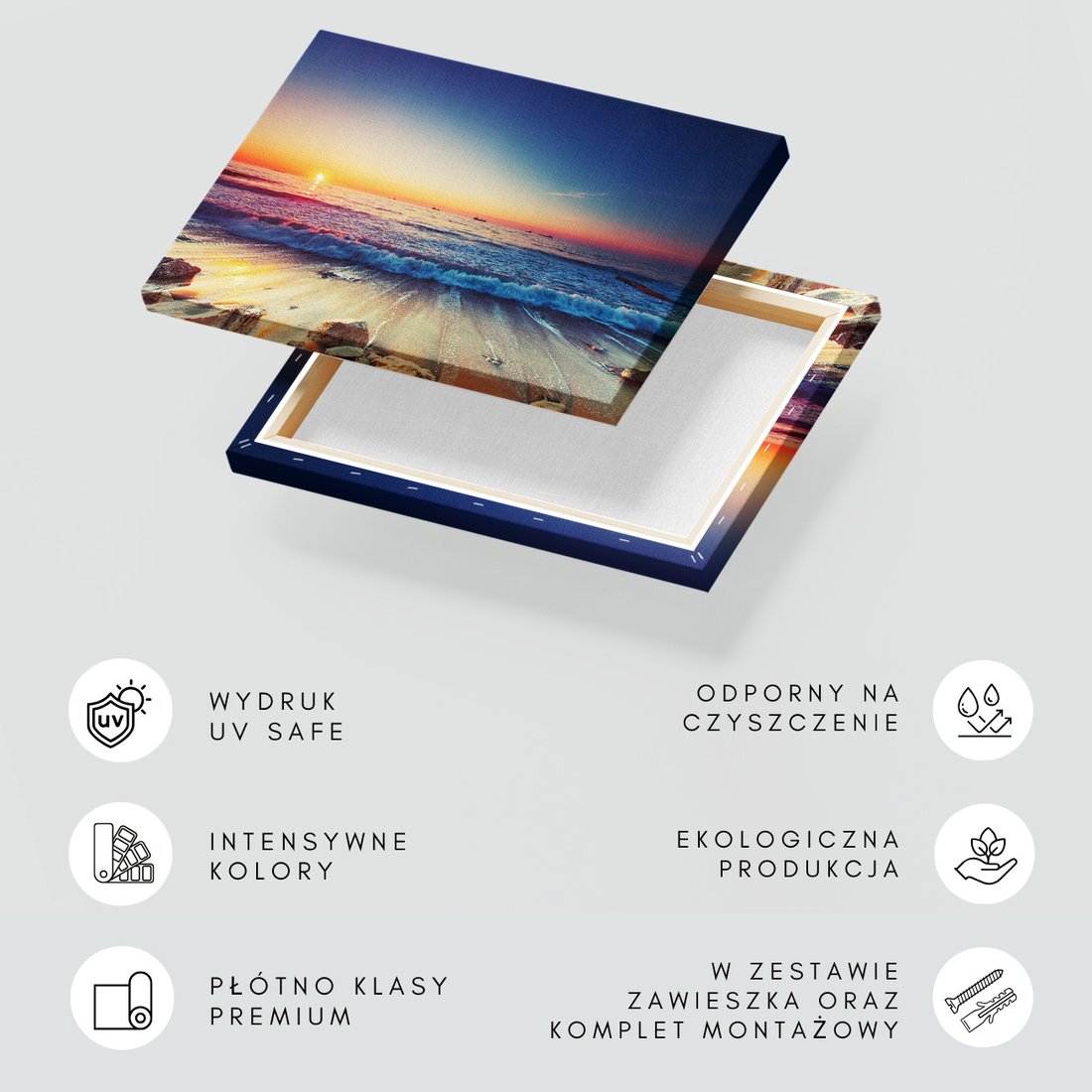 Obraz na płótnie z motywem plaża, morze, zachód słońca to kwintesencja estetyki i trwałości. Dzięki łatwemu montażowi i uniwersalnemu wzornictwu, czyni go idealnym wyborem zarówno do codziennego użytku, jak i na wyrafinowany prezent.