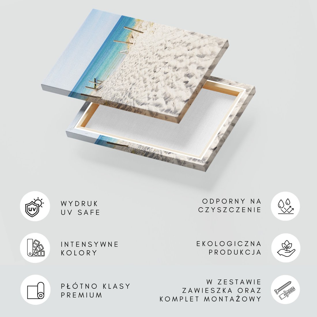 Obraz na płótnie z motywem plaża, piasek, morze to kwintesencja estetyki i trwałości. Dzięki łatwemu montażowi i uniwersalnemu wzornictwu, czyni go idealnym wyborem zarówno do codziennego użytku, jak i na wyrafinowany prezent.