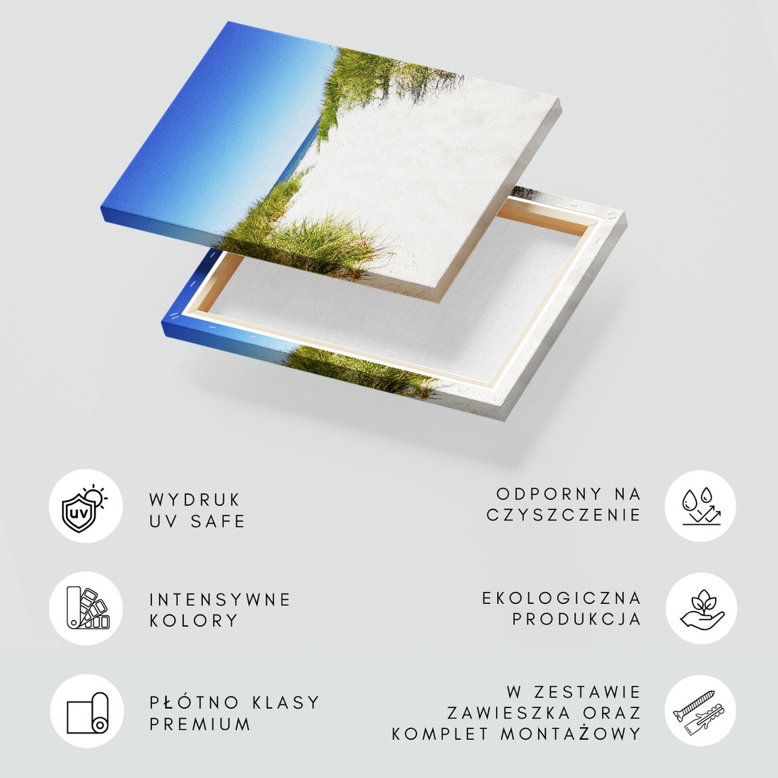 Obraz na płótnie z motywem plaża, piasek, morze to kwintesencja estetyki i trwałości. Dzięki łatwemu montażowi i uniwersalnemu wzornictwu, czyni go idealnym wyborem zarówno do codziennego użytku, jak i na wyrafinowany prezent.