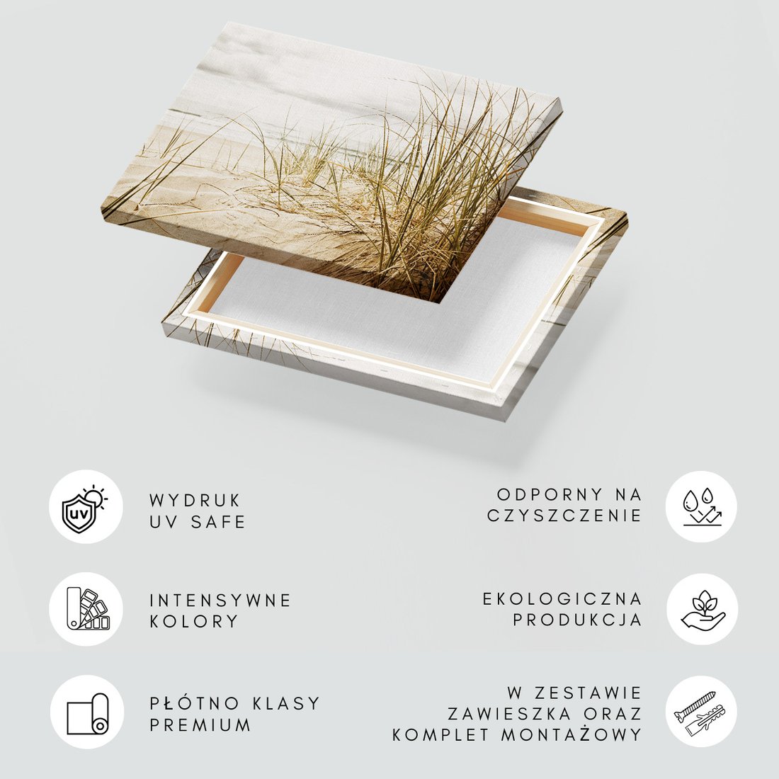 Obraz na płótnie z motywem plaża, trawa, morze to kwintesencja estetyki i trwałości. Dzięki łatwemu montażowi i uniwersalnemu wzornictwu, czyni go idealnym wyborem zarówno do codziennego użytku, jak i na wyrafinowany prezent.