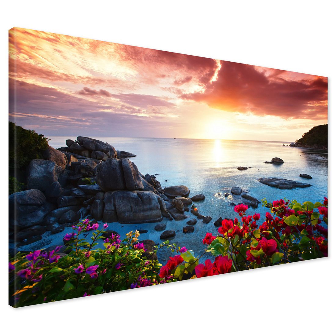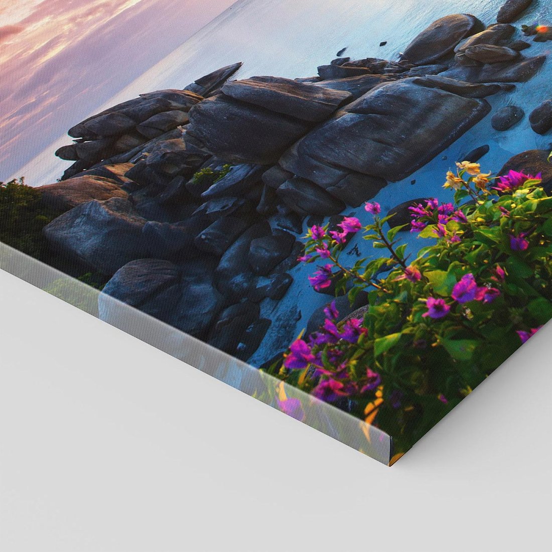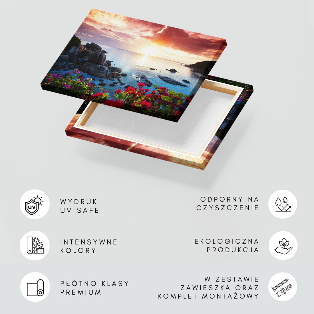 Obraz na płótnie z motywem plaża, zachód słońca, kwiaty to kwintesencja estetyki i trwałości. Dzięki łatwemu montażowi i uniwersalnemu wzornictwu, czyni go idealnym wyborem zarówno do codziennego użytku, jak i na wyrafinowany prezent.