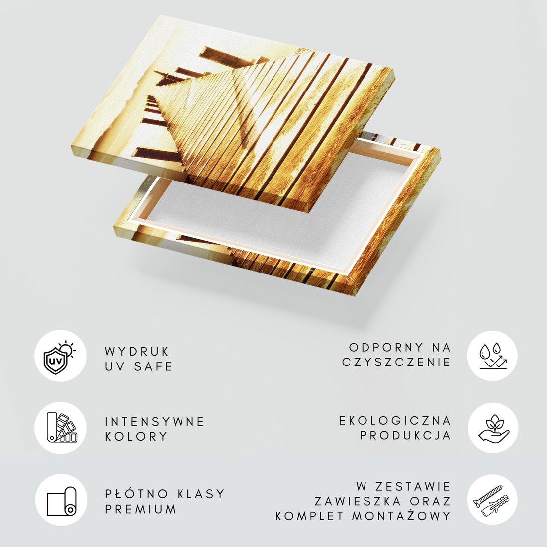 Obraz na płótnie z motywem pomost, jezioro, drewno to kwintesencja estetyki i trwałości. Dzięki łatwemu montażowi i uniwersalnemu wzornictwu, czyni go idealnym wyborem zarówno do codziennego użytku, jak i na wyrafinowany prezent.