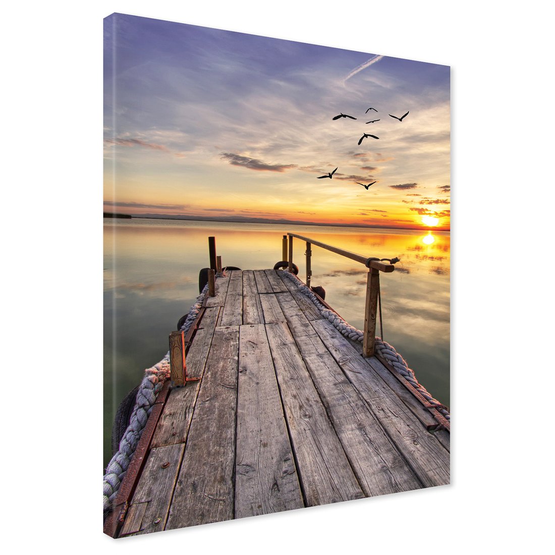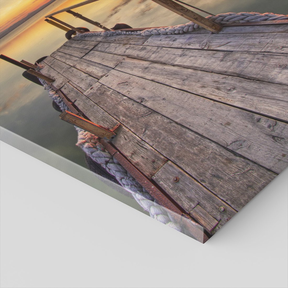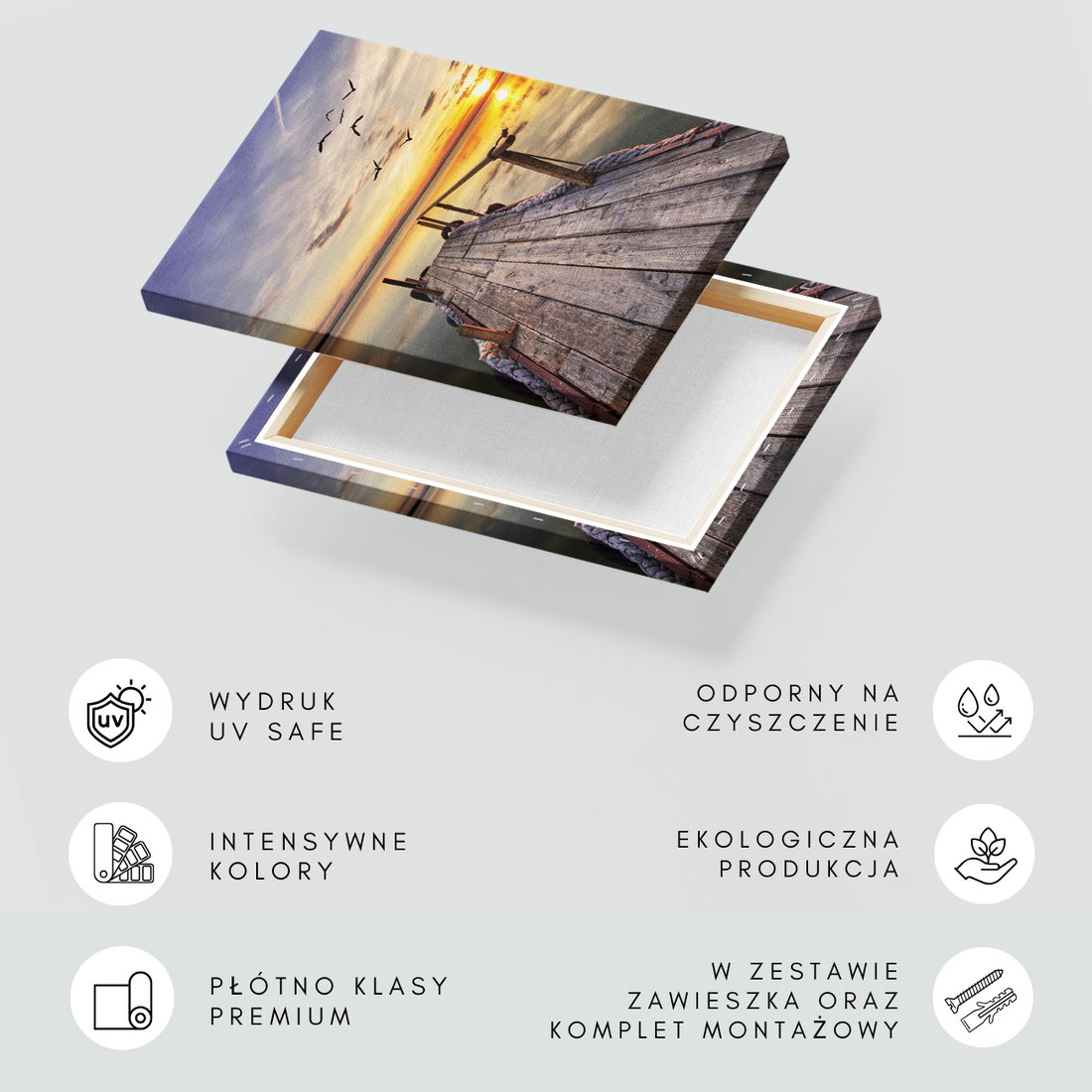 Obraz na płótnie z motywem pomost, woda, zachód słońca to kwintesencja estetyki i trwałości. Dzięki łatwemu montażowi i uniwersalnemu wzornictwu, czyni go idealnym wyborem zarówno do codziennego użytku, jak i na wyrafinowany prezent.