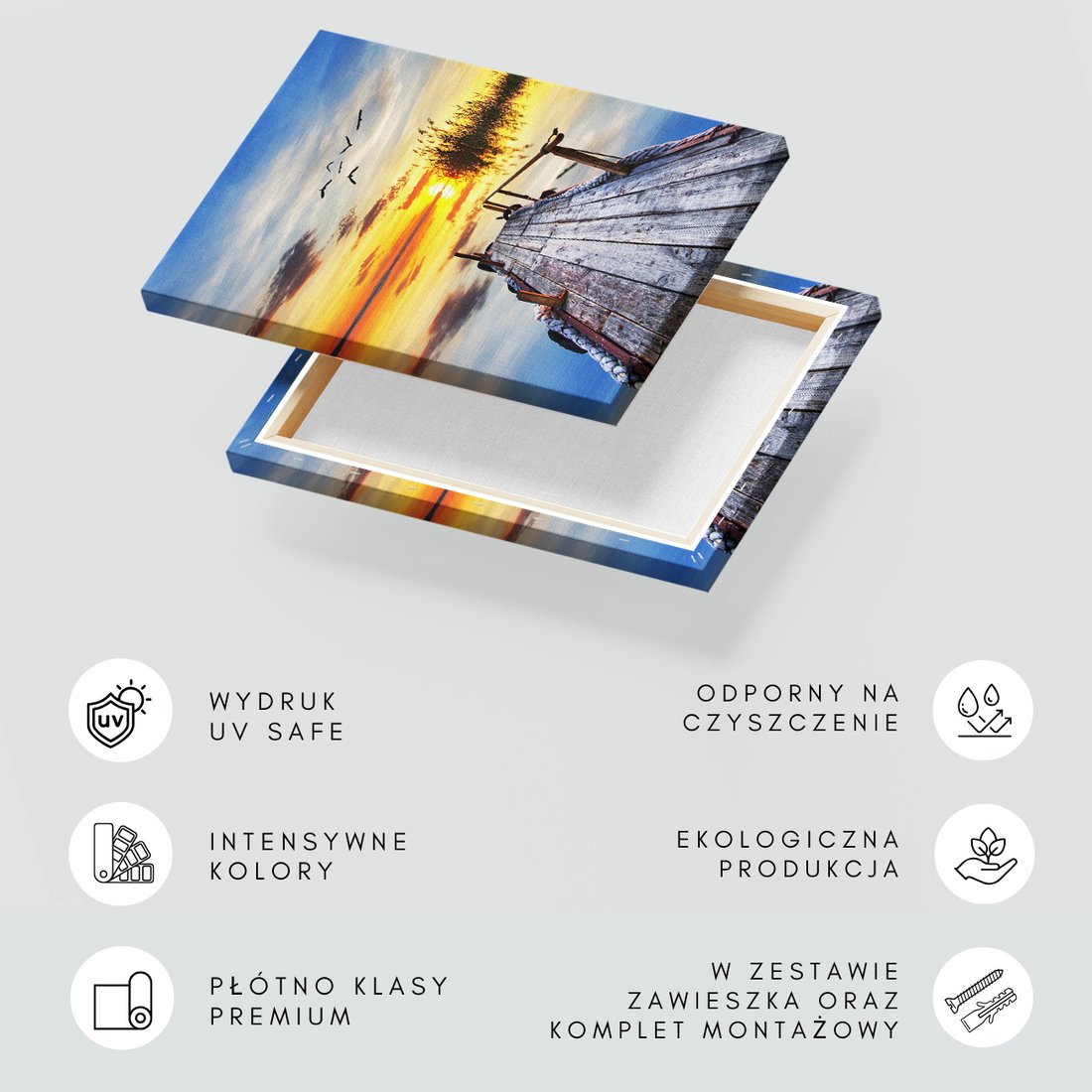 Obraz na płótnie z motywem pomost, zachód słońca, jezioro to kwintesencja estetyki i trwałości. Dzięki łatwemu montażowi i uniwersalnemu wzornictwu, czyni go idealnym wyborem zarówno do codziennego użytku, jak i na wyrafinowany prezent.