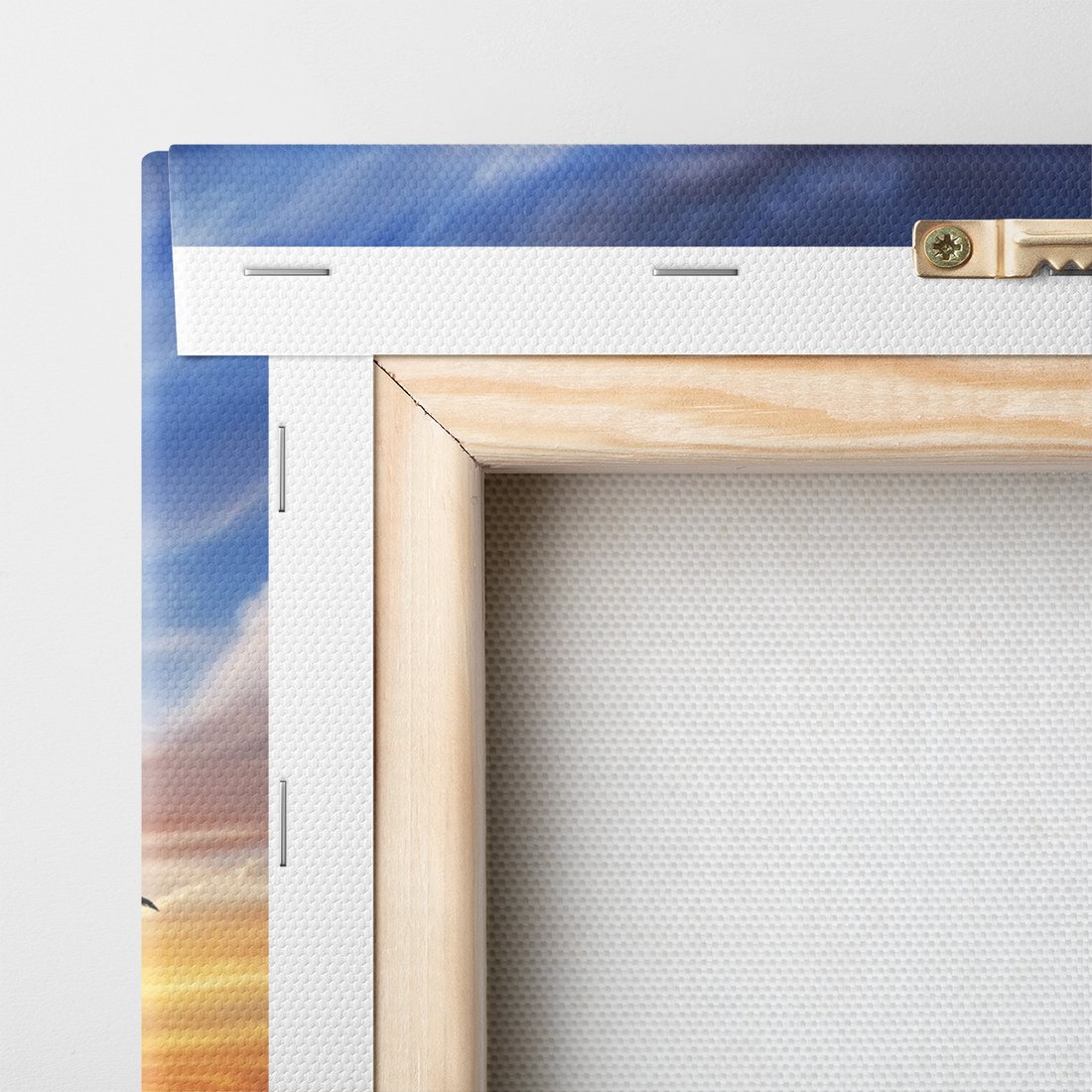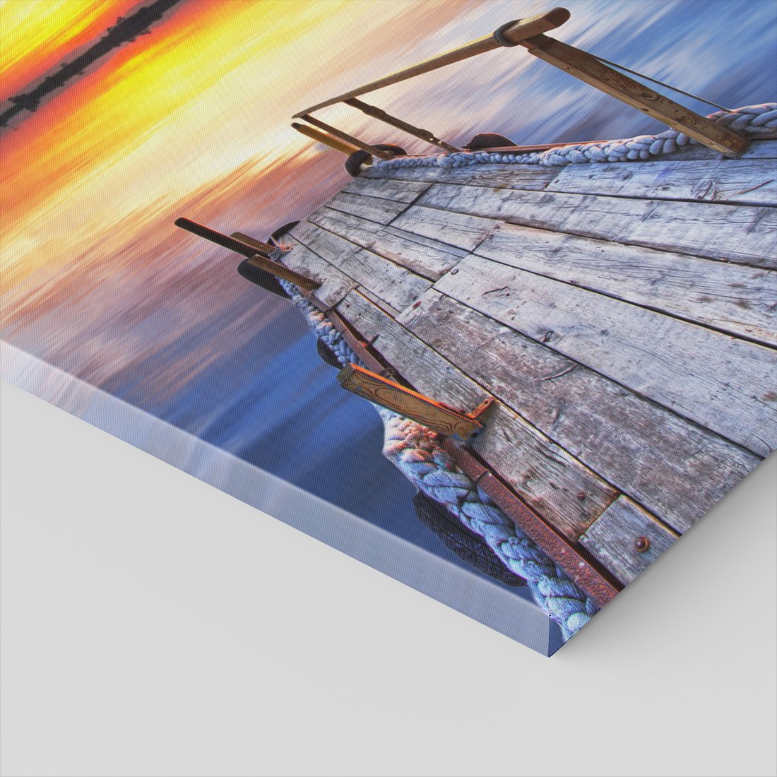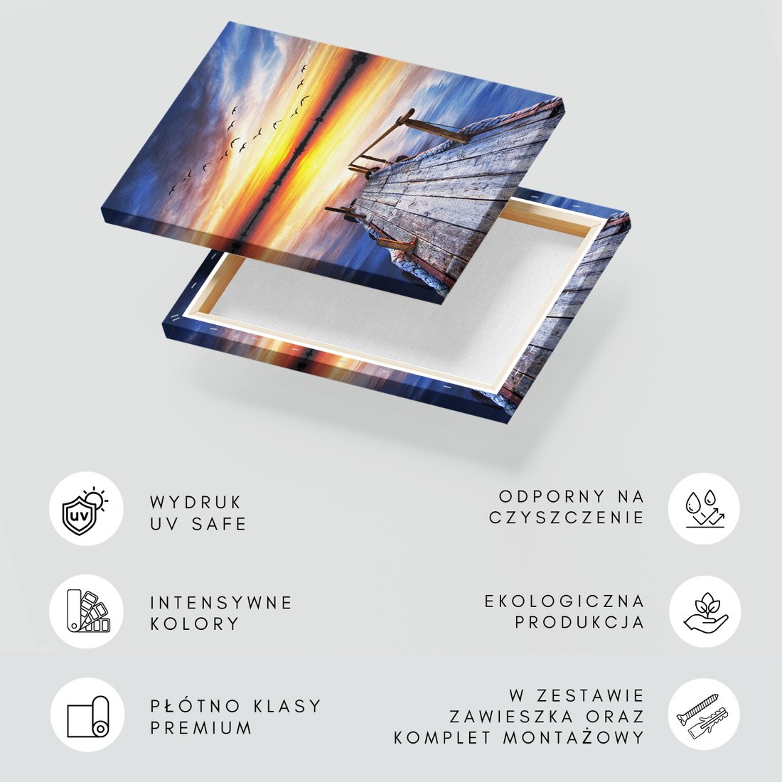 Obraz na płótnie z motywem pomost, zachód słońca, ptaki to kwintesencja estetyki i trwałości. Dzięki łatwemu montażowi i uniwersalnemu wzornictwu, czyni go idealnym wyborem zarówno do codziennego użytku, jak i na wyrafinowany prezent.