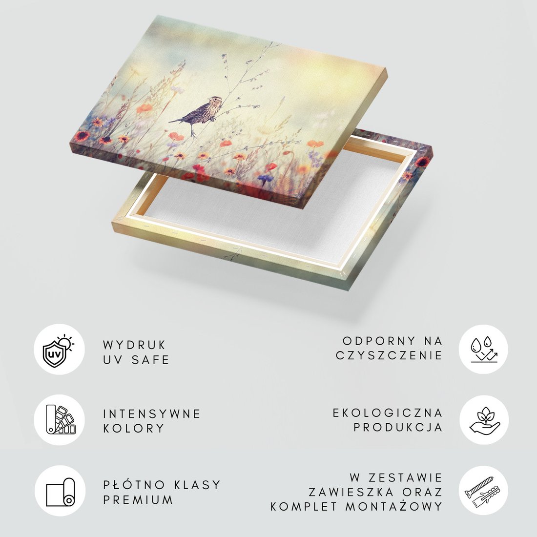 Obraz na płótnie z motywem ptak, kwiaty, łąka to kwintesencja estetyki i trwałości. Dzięki łatwemu montażowi i uniwersalnemu wzornictwu, czyni go idealnym wyborem zarówno do codziennego użytku, jak i na wyrafinowany prezent.
