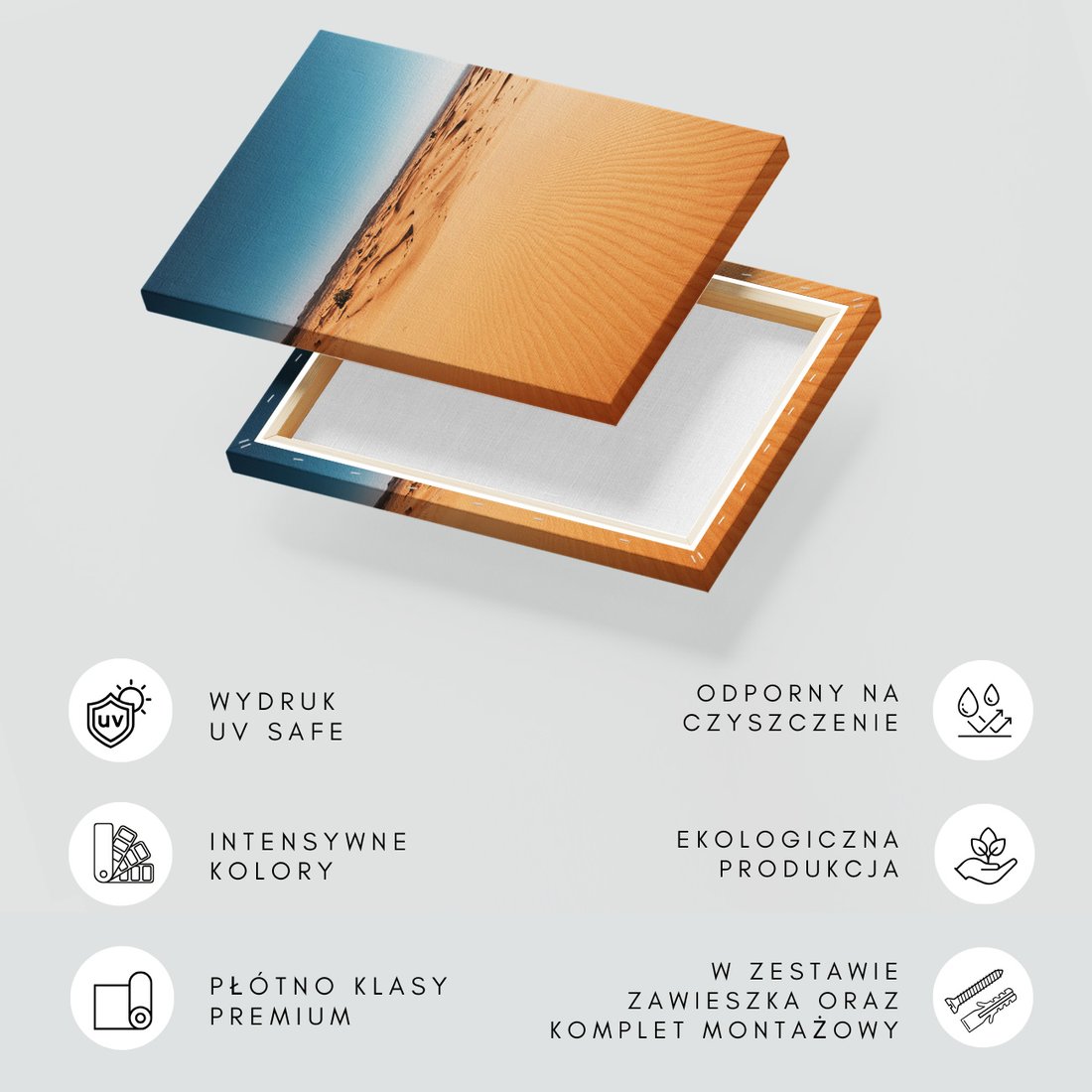 Obraz na płótnie z motywem pustynia, piasek, niebo to kwintesencja estetyki i trwałości. Dzięki łatwemu montażowi i uniwersalnemu wzornictwu, czyni go idealnym wyborem zarówno do codziennego użytku, jak i na wyrafinowany prezent.