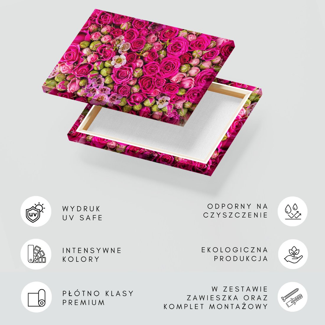 Obraz na płótnie z motywem róże, kwiaty, bukiet to kwintesencja estetyki i trwałości. Dzięki łatwemu montażowi i uniwersalnemu wzornictwu, czyni go idealnym wyborem zarówno do codziennego użytku, jak i na wyrafinowany prezent.
