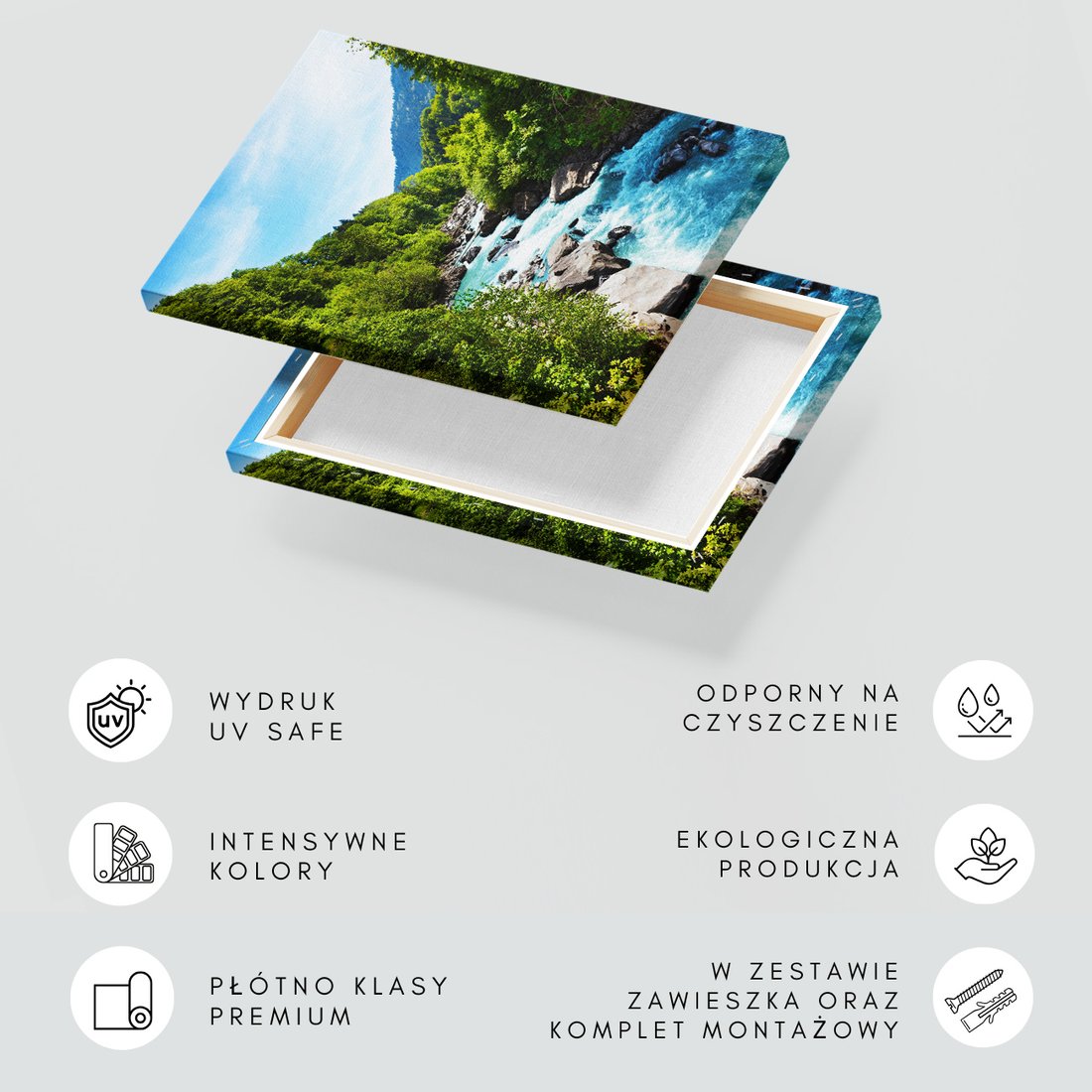 Obraz na płótnie z motywem rzeka, góry, las to kwintesencja estetyki i trwałości. Dzięki łatwemu montażowi i uniwersalnemu wzornictwu, czyni go idealnym wyborem zarówno do codziennego użytku, jak i na wyrafinowany prezent.